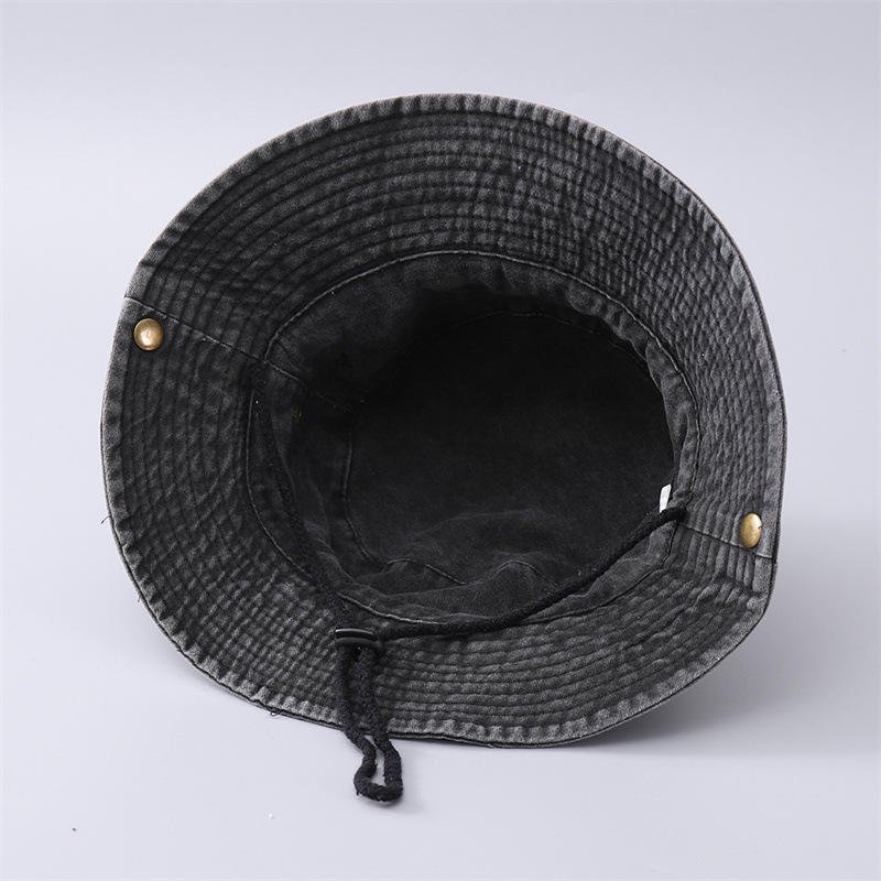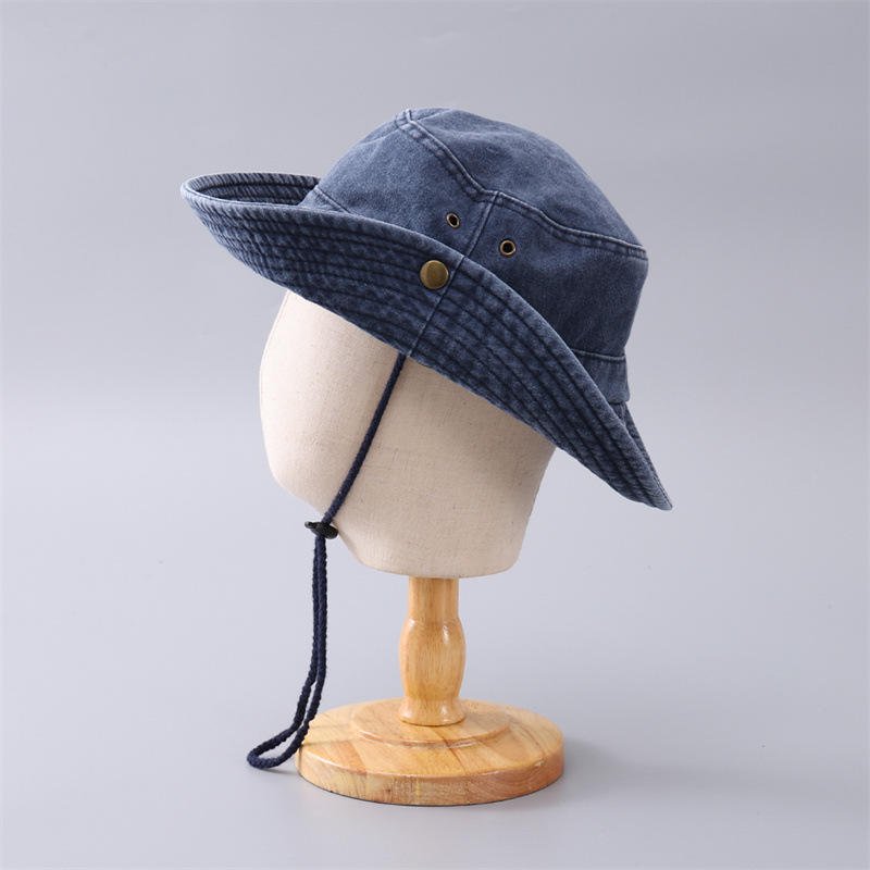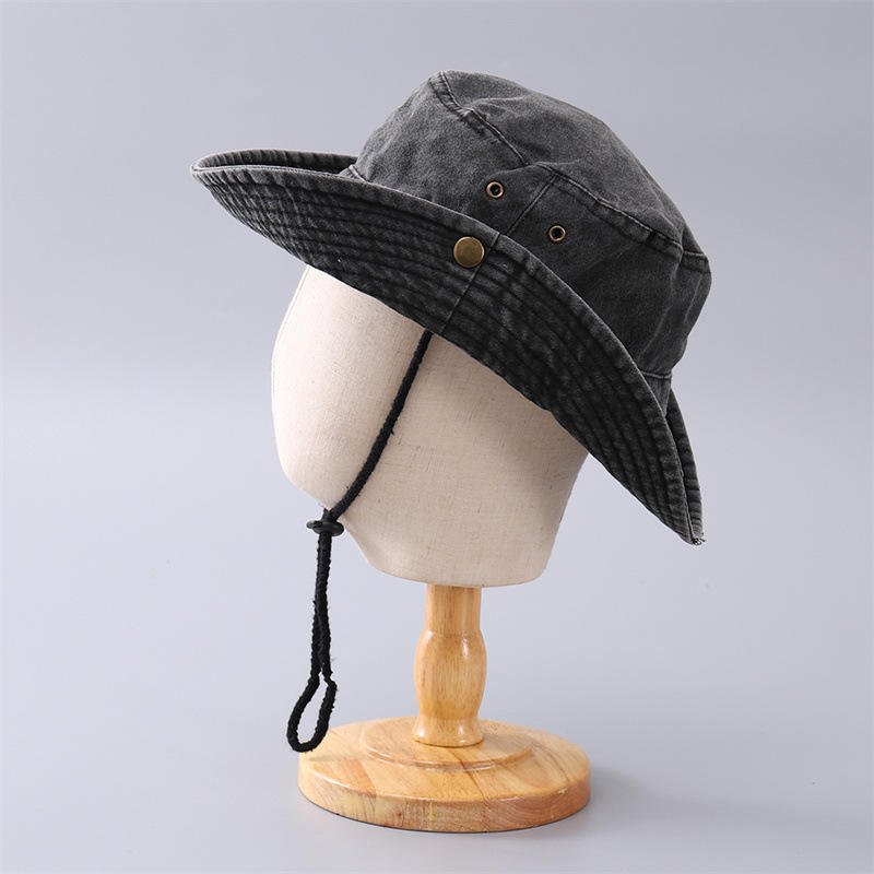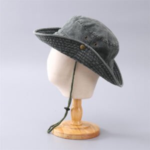 This rugged and stylish outdoor hat is perfect for hiking, fishing, camping, or everyday casual wear. Featuring a classic distressed, washed look for a vintage aesthetic, it combines the sun protection of a boonie hat with the relaxed style of a bucket hat. It is constructed with a durable fabric (listed as 100% Polyester) and includes practical details like a chin strap/drawcord for a secure fit and metal ventilation eyelets to keep you cool.
